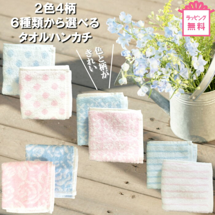 選べる4柄/2色の8種類 【タオルハンカチサイズ】 20cm×20cm 【タオルハンカチの素材】 綿100% 中国製/ベトナム製 【タオルハンカチの柄と色】 ——————————————————— ロザリオ地柄 | ピンク | ブルー | ——————————————————— ドロップ柄 | ピンク | ブルー | ——————————————————— メイグイ地柄 | ピンク | ブルー | ——————————————————— ストライプ柄 | ピンク | ブルー | ——————————————————— ※ラッピング無料※ ピンク系のハンカチにはピンクの紙リボン ブルー系のハンカチにはブルーの紙リボンでお届けします。